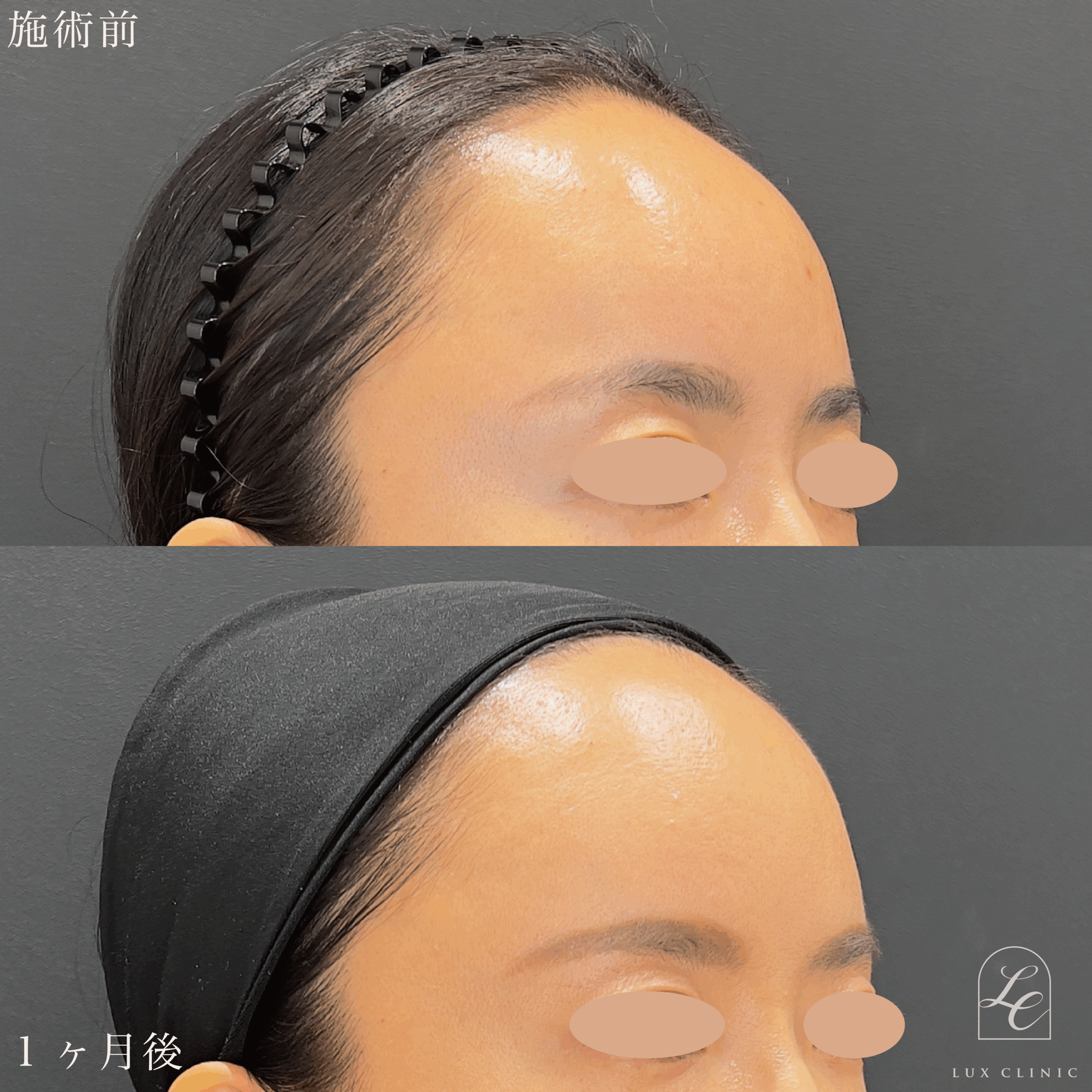 - ◆エランセMは、PCL(ポリカプロラクトン)とCMC(カルボキシメチルセルロース)を主成分とする、コラーゲン誘導型フィラーです。約2年間ほど効果が持続しますが、分解する薬剤がないことが注意点です。額の凸凹を修正したり、額を丸くする際に使用します。