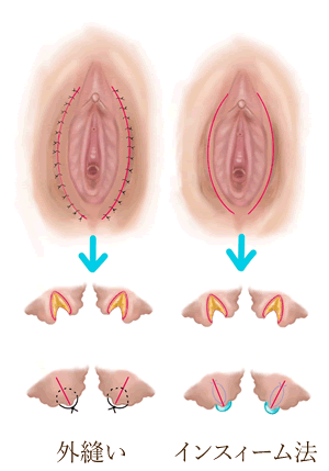 また、外陰部は感染が生じ易い場所なのですが、インスィーム法であれば表面に糸が出ることがありませんので、糸を通じて細菌が入り込むことで生じる感染を抑えることが可能と考えております。