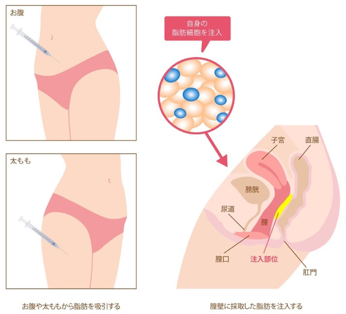 膣内脂肪注入とは、ご自身のお腹や太ももから脂肪を採取し、その脂肪細胞を膣の粘膜下に注入することで、加齢や出産により伸びて緩んでしまった膣をふっくらさせ、膣内腔を狭くする治療法です。自身の脂肪細胞を利用するためアレルギーのリスクが少ないことが特徴です。定着した脂肪は長期間に渡り効果を持続します。