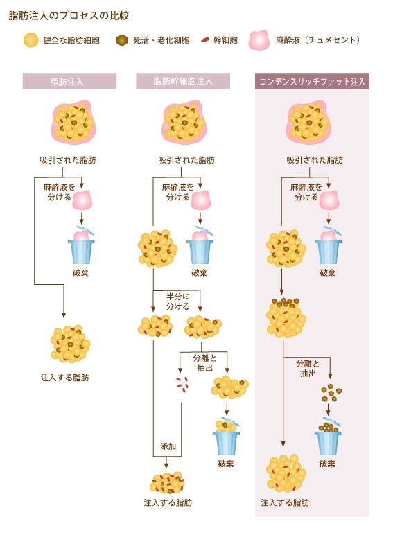 また、コンデンスリッチ脂肪注入とは、採取した脂肪を遠心分離にかけて不純物を除去し、濃縮脂肪細胞(コンデンスリッチファット・CRF) だけを注入する治療法です。そのため、通常の脂肪注入よりコンデンスリッチ脂肪注入の方が定着率は高く、しこりもできにくいとされています。