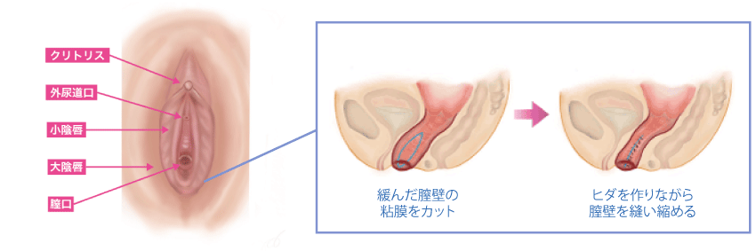 膣縮小手術は、加齢や出産などが原因で緩んでしまった膣を、糸で縫い縮めて小さくする手術のことです。一度緩んでしまうと、時間経過により多少は改善しますが完全に元に戻ることはありません。