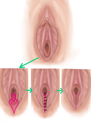 他にもヒアルロン酸注入や再生治療、レーザーなどの治療もありますが、腟壁縮小手術、腟括約筋縫縮術はあらゆる治療の中で最も効果の高い治療になります。腟壁縮小手術では、産後に緩んでしまった腟壁を腟の奥から切開し縮小します。腟周辺の筋肉を縮小縫合し、新たに腟のヒダを形成することが可能です。