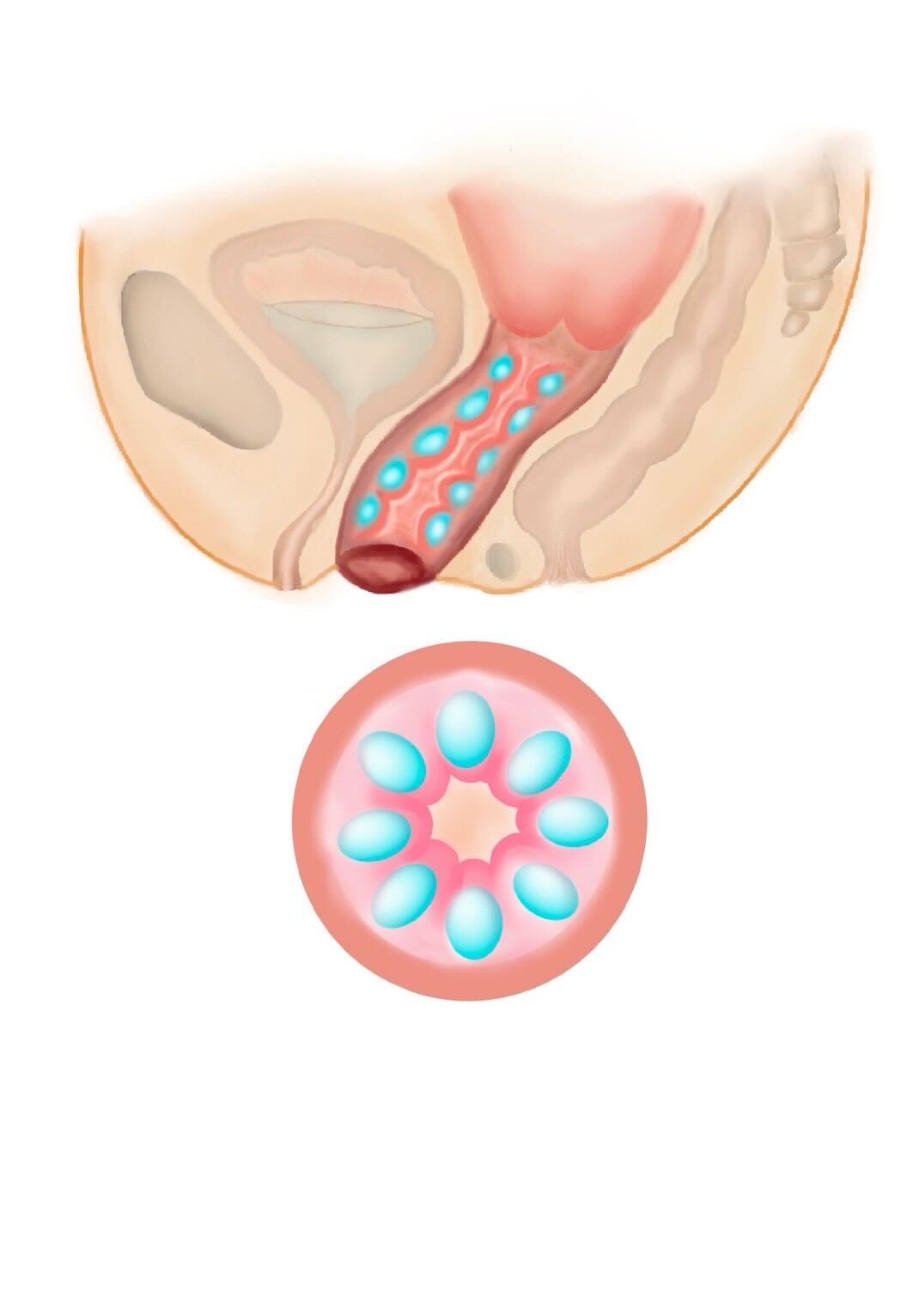 また同時に入り口付近にある腟括約筋を縫縮すると、入り口から腟の奥まで縮小され、高い効果が得られます。 腟は直腸に接するようにすぐ前に位置しますので、繊細な作業を要し、高い技術が必要です。