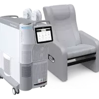 - 服を着たまま、椅子の座席と背もたれにアプリケーターが組み込まれた快適なインティマウェーブ™チェアに座り、プログラムをセットします。腹部や上腕・下腿の治療を行う場合には、専用のアプリケーターを装着します。